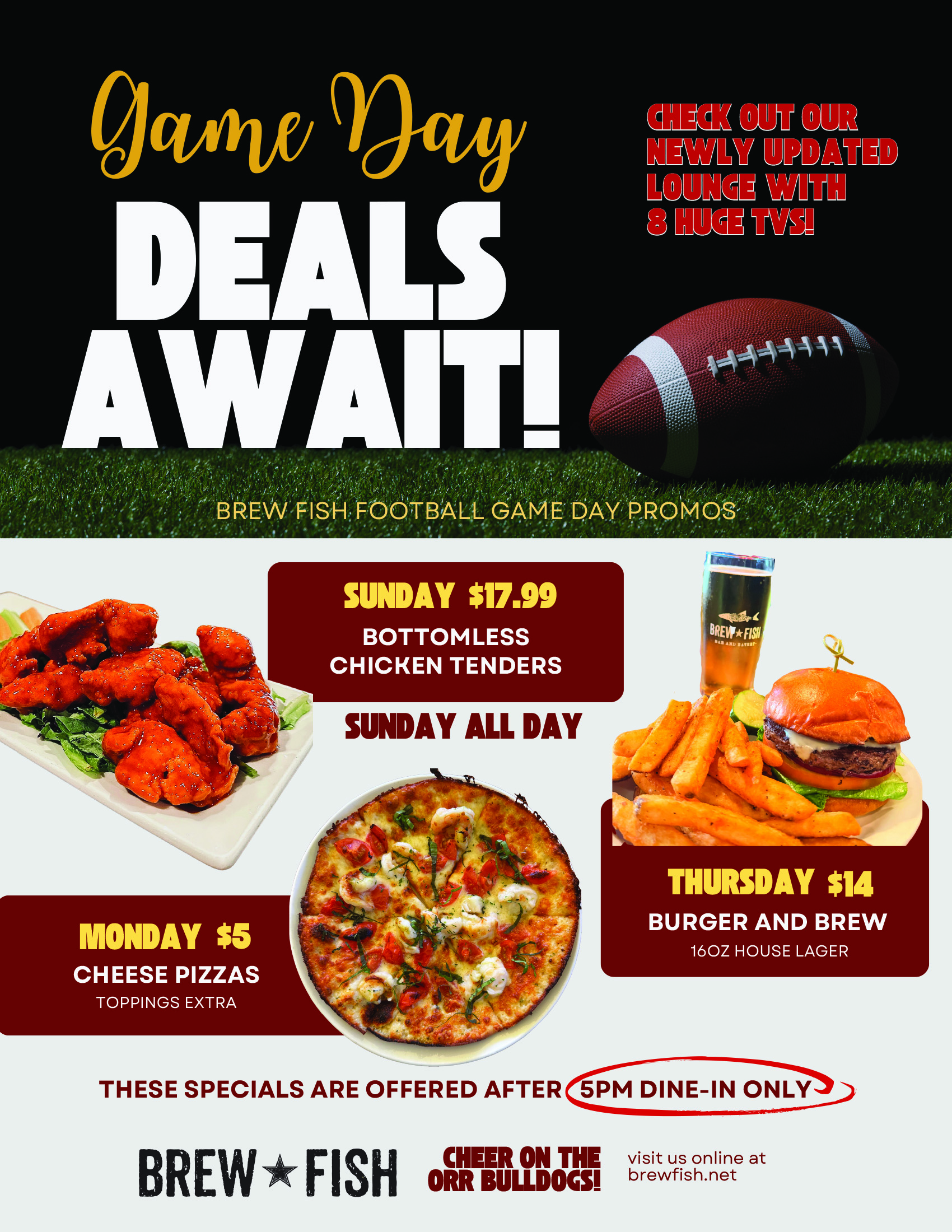 Join us at Brew Fish for Football games and great deals! The lounge is newly updated with 8 large screen TVs and comfy seats - grab your crew and head to BREW for some Football action!